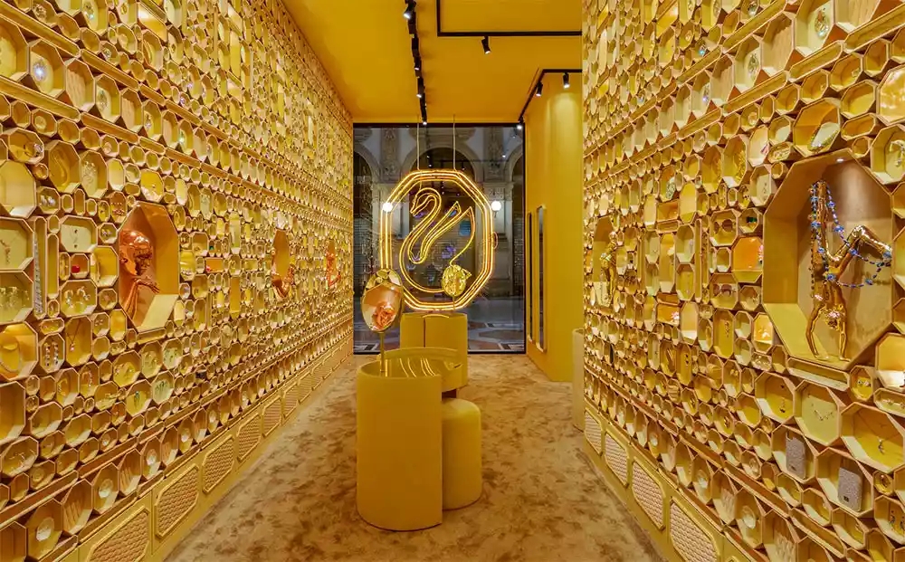 施华洛世奇(Swarovski)委任Giovanna Battaglia Engelbert对品牌形象进行重新设计,在保留天鹅元素的基础上,增加了水晶感,整体造型一只在水晶中起飞的天鹅。